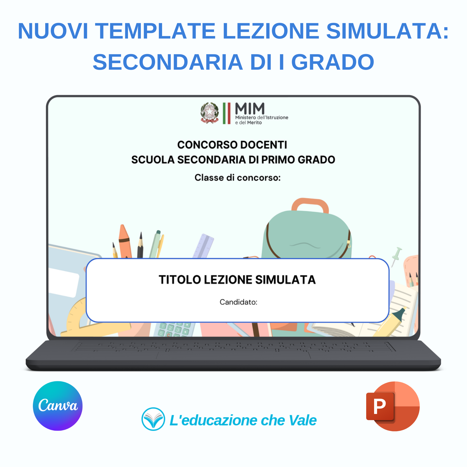 Template e guida per la lezione simulata del concorso docenti in formato Canva e PPTX (PowerPoint).